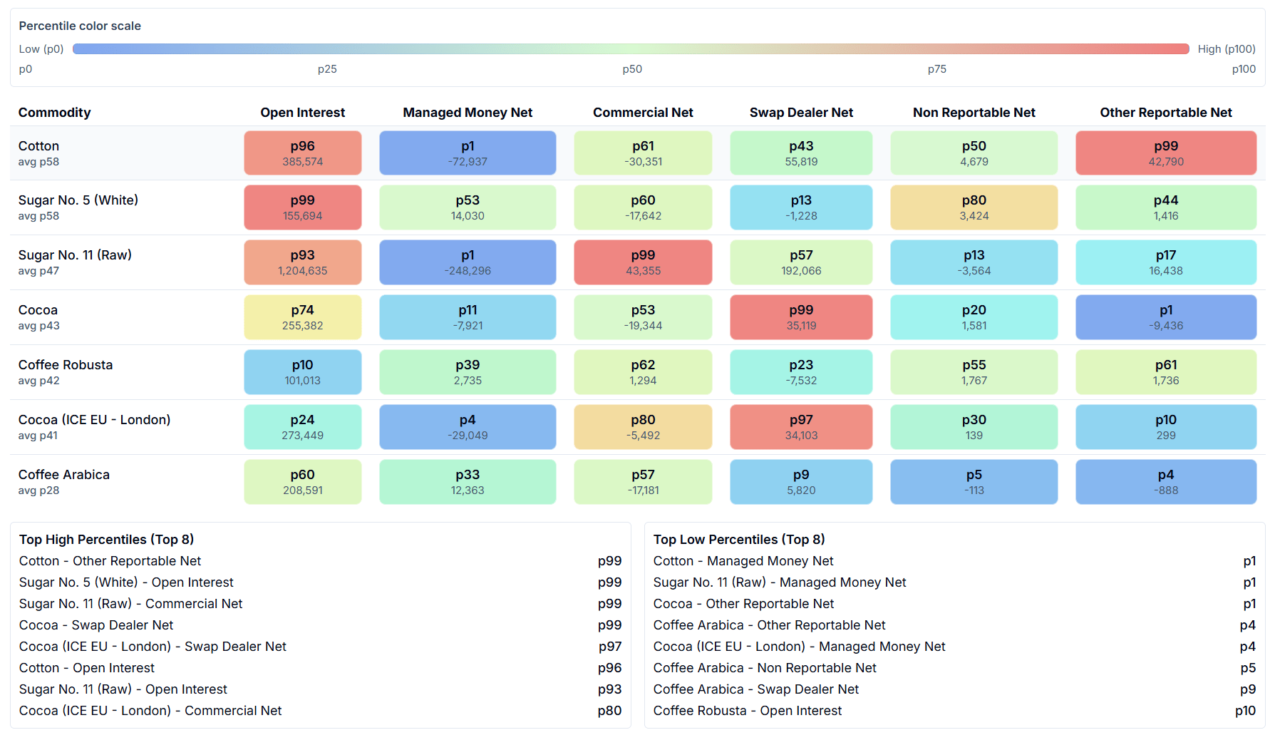 At the same time, the macro backdrop is beginning to shift in cotton’s favour. Crude holding above $90, a softer dollar, and sharply higher freight rates are pushing up the polyester cost curve and improving the competitiveness of U.S. cotton into export channels. Add to that a sizeable speculative net short of nearly 73,000 contracts, and the market has the ingredients for a meaningful short-covering rally if sentiment starts to turn.