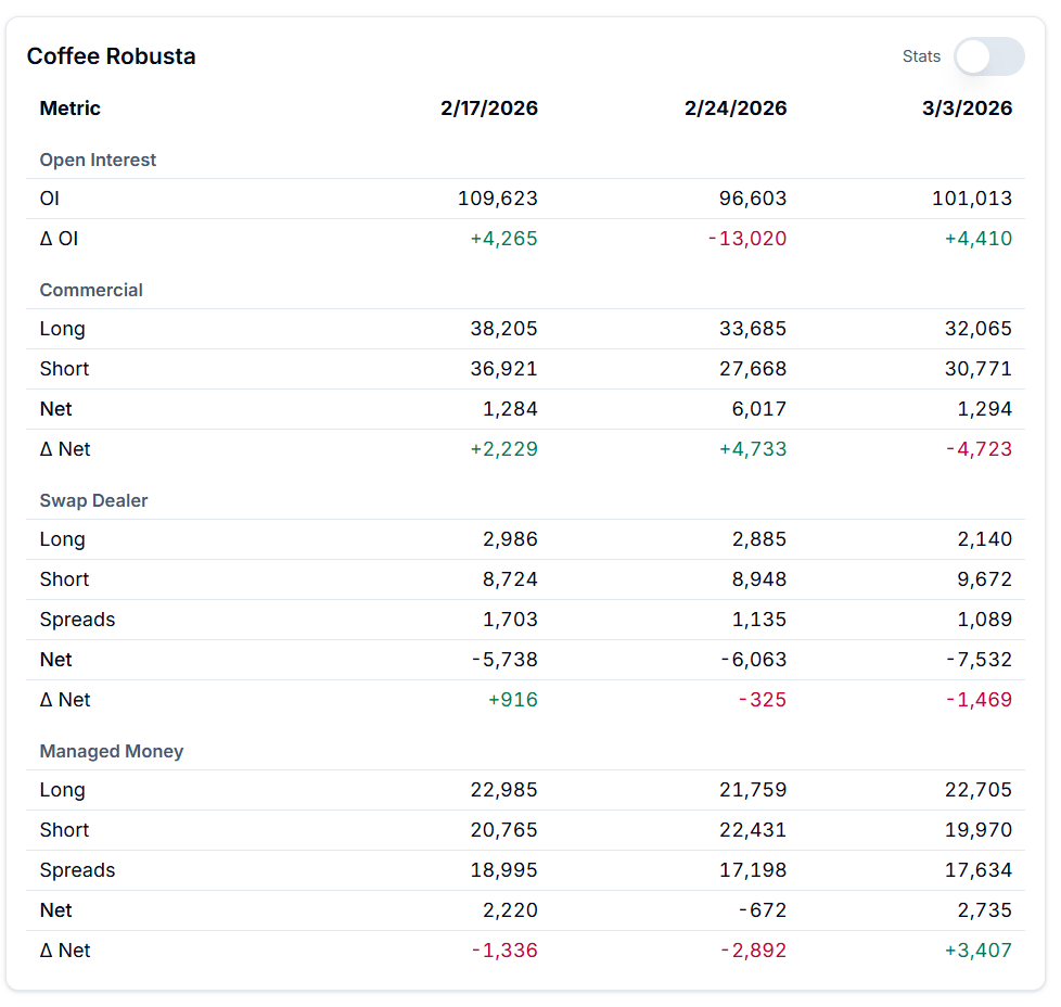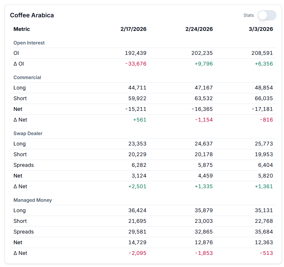 For Arabica CFTC Managed Money: Longs steadily reducing and shorts getting slightly more confident.