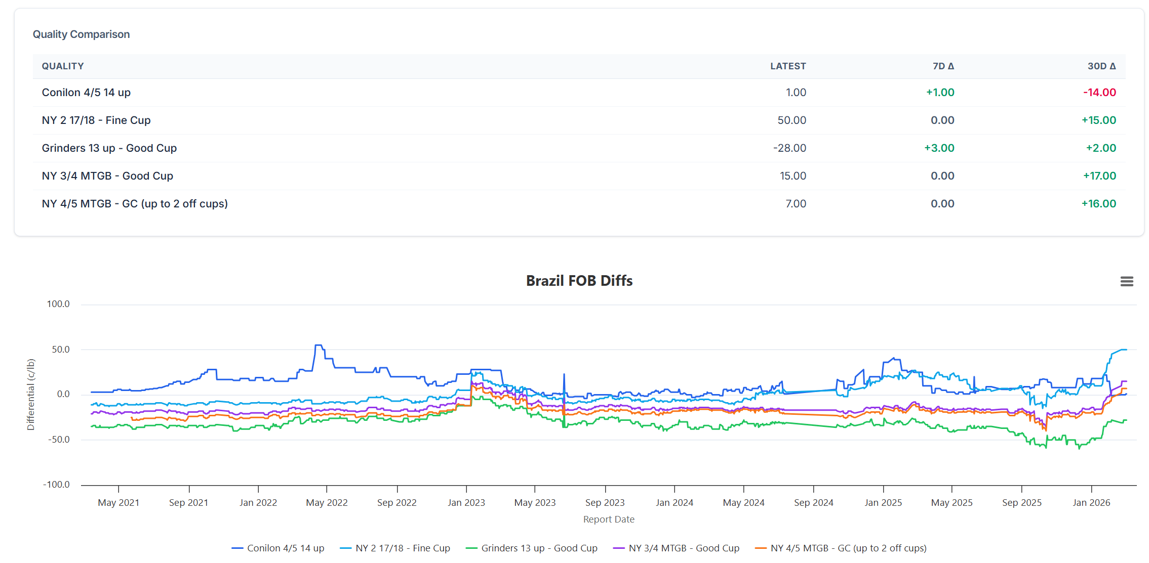 Brazil differentials: Robusta diffs remain weak, whilst Brazil Arabica stays strong. CAM Diffs have started moving higher as well.