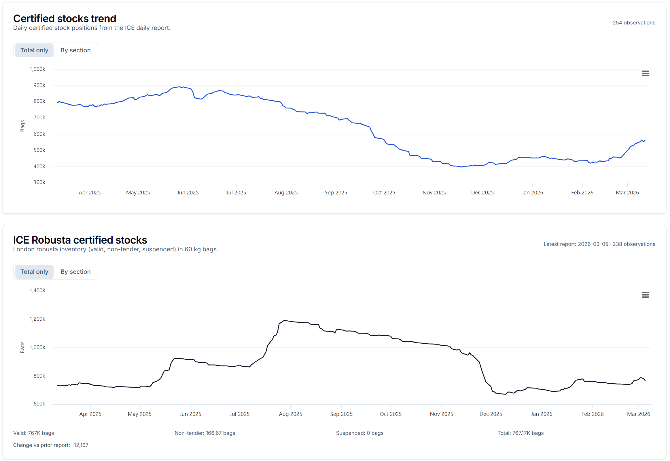 Certified stocks: There have been ~100 k bag deliveries to the board primarily of Hondurian Origin.