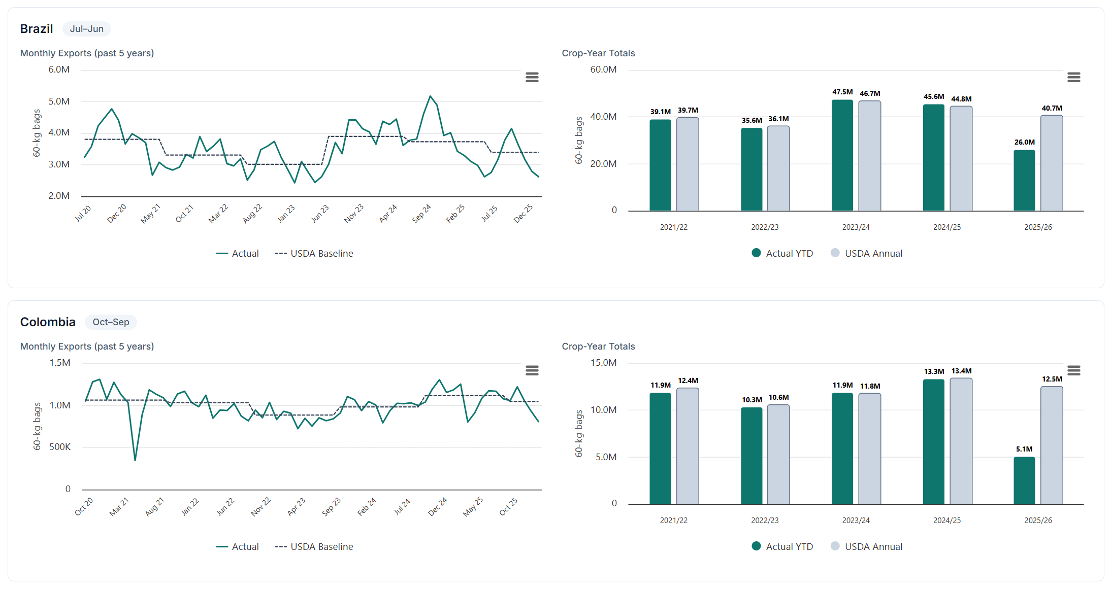 Brazil and Colombia export pace: Much slower YoY due to smaller crop, tariffs and high differentials.