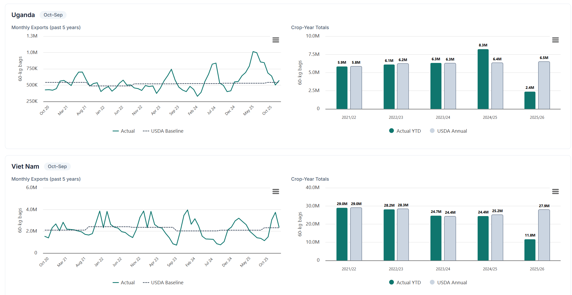Vietnam exports: Exports are healthy as demand ahead of the arrival of Conilon. Uganda has been overall strong this market year.
