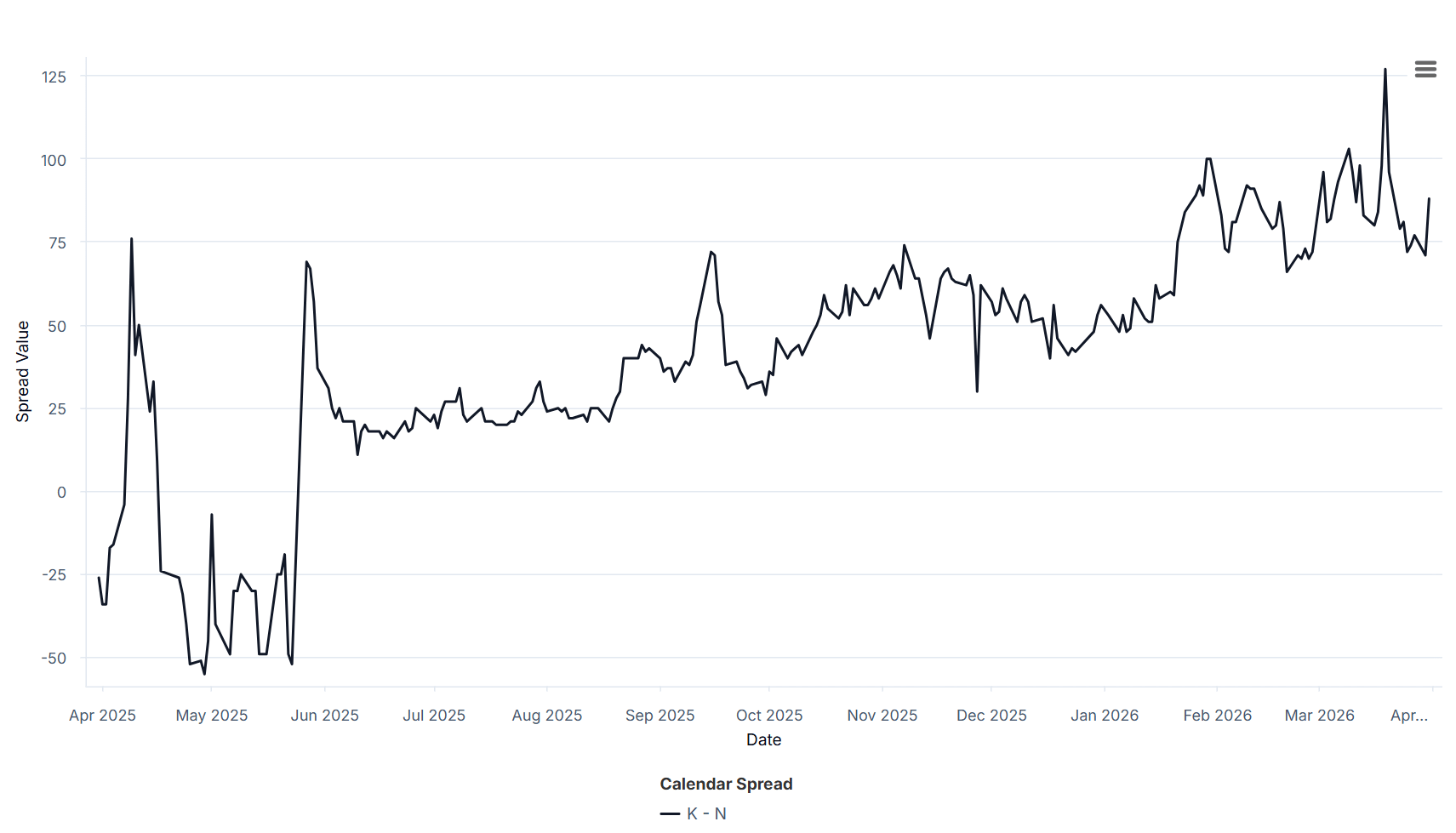 The recent rally has reduced some of the carry in the front of the curve, with backwardation emerging from K27 onwards.