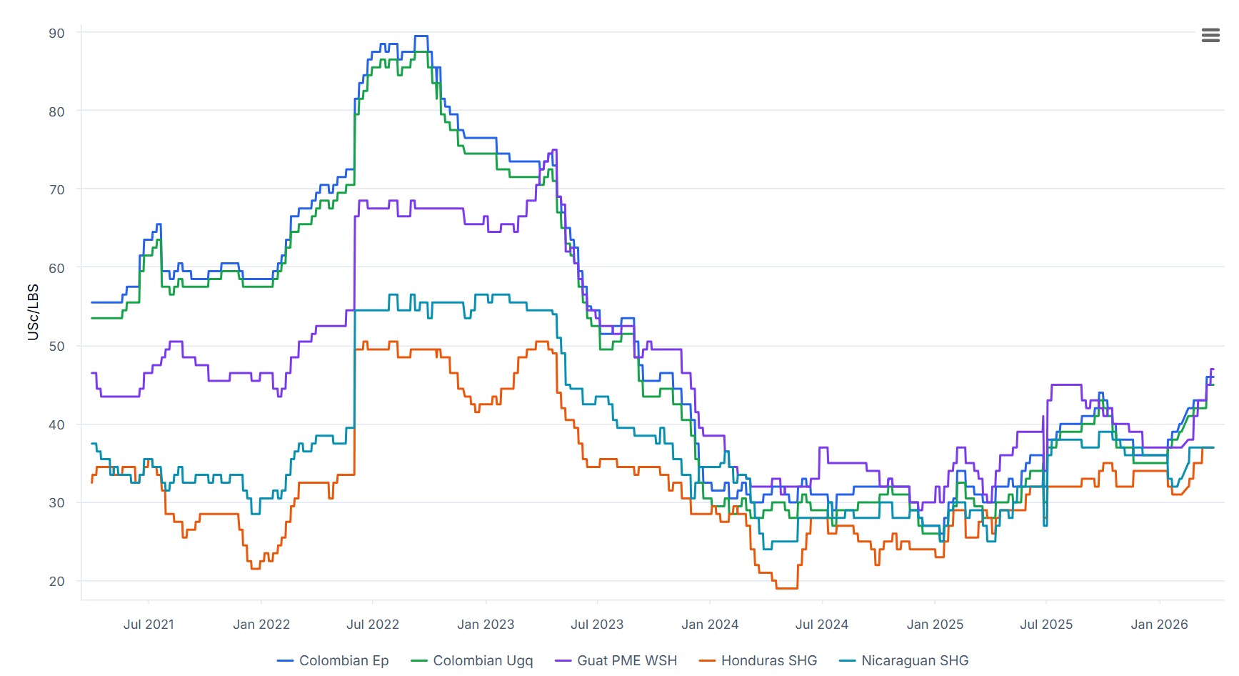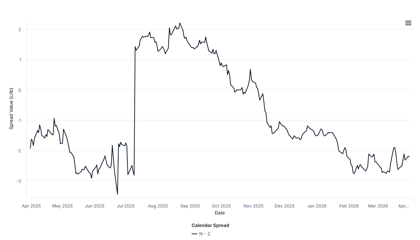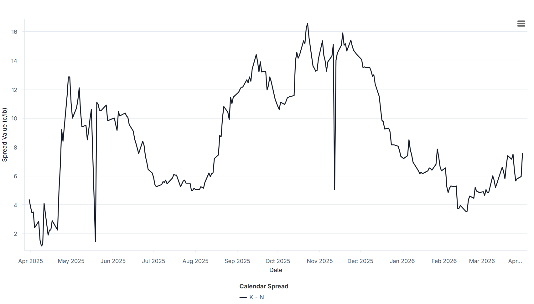 Elevated Brazilian and Colombian diffs look like a structural short rather than genuine scarcity; expect compression once new-crop volumes arrive