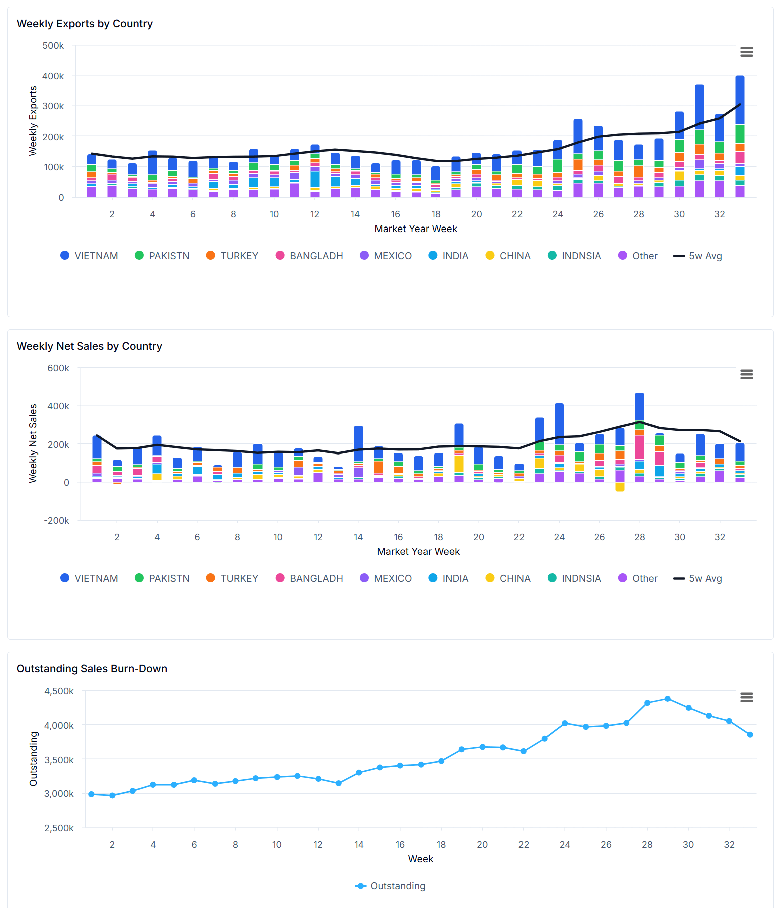 US Cotton Exports, continue to be strong, with pace picking up over the past two weeks. We project that the U.S. will export ~11.6 million bales, which is an increase of 0.3 million bales since our last report.