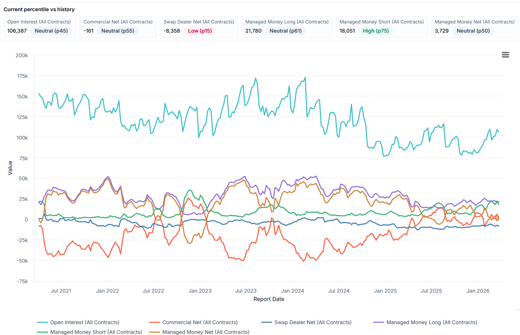 CFTC Managed Money: Managed Money has reduced its short position as the market has rallied, covering ~30k lots over the past three weeks.